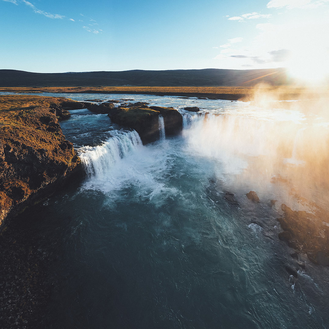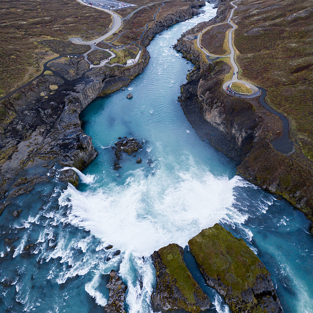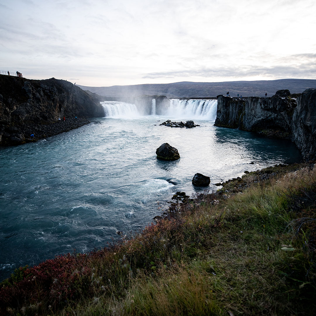 Bezoek Goðafoss, de ‘waterval van de goden’, op weg naar Akureyri. Verken de stad, haar musea, galerieën, botanische tuin en fjordlandschap.