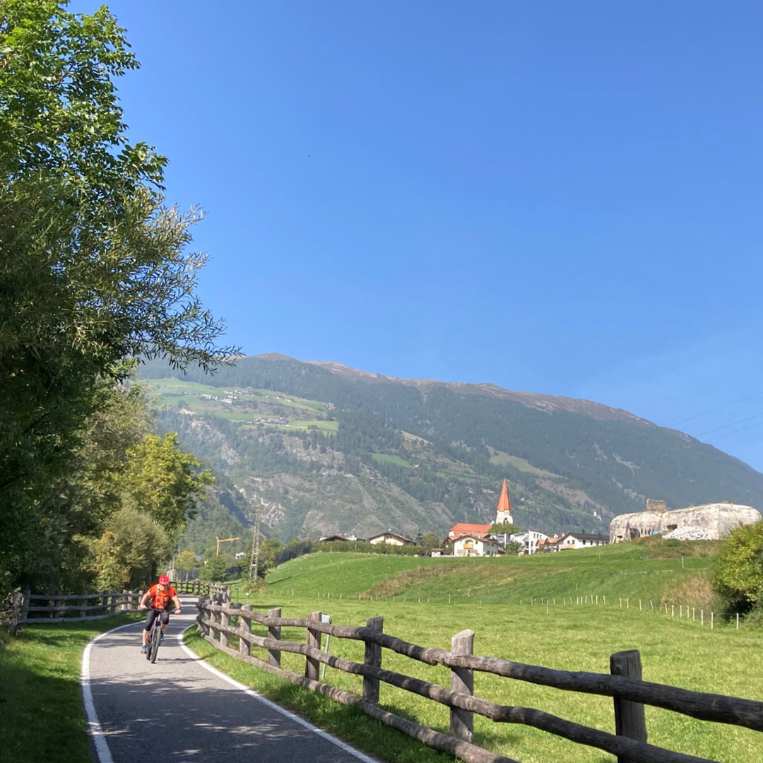 Je fietst langs de kerktoren van Graun naar Glurns, de kleinste stad van Zuid-Tirol. Vervolgens rijd je door de Vinschgau naar Schlanders, Naturns of de omgeving.