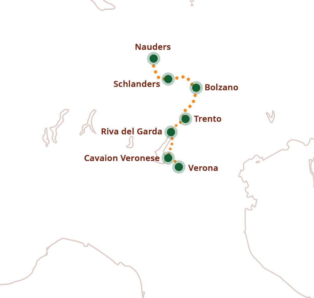 Al in de tijd van de Romeinen werd gezocht naar gemakkelijke routes over de Alpen en zo is de Etsch-fietsroute naar Verona doorgaans goed begaanbaar. De route loopt meestal bergafwaarts, waardoor je ontspannen kunt fietsen. Vanaf Merano volg je het brede Etschtal grotendeels langs de rivier de Etsch, via Bozen en Trento naar Verona.