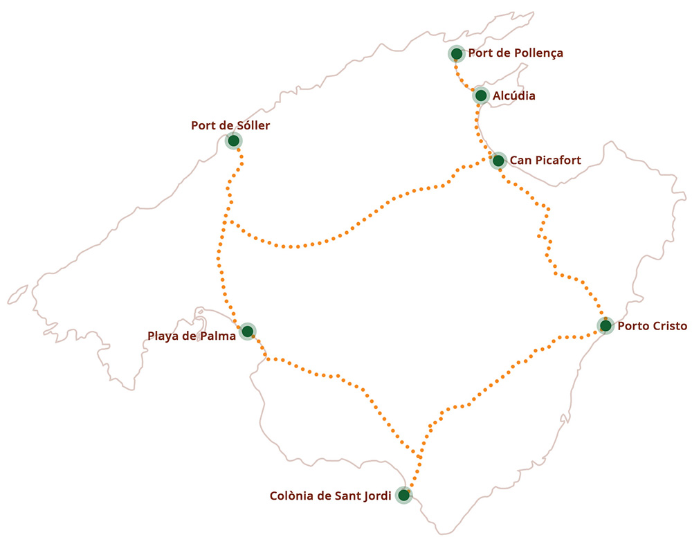 Via het rustige dorpje Son Carrió fiets je naar Manacor, bekend om zijn Majorica-keramiek. Hier vind je talloze winkels met keramieksouvenirs. Daarna fiets je door Petra, waar een typische Mallorcaanse middagsnack op je wacht. Via Santa Margalida fiets je door een betoverend landschap naar Can Picafort, waar je opnieuw kunt genieten van een ontspannen avond aan het strand.
