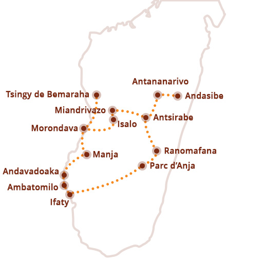 De reis begint in hoofdstad Antananarivo, waarna je via het regenwoud van Andasibe afzakt naar de koloniale hooglanden van Antsirabe. Via de droge savannes van Miandrivazo reis je naar het westen, waar je het ruige landschap van Kirindy verkent en het surrealistische kalkstenen woud van Tsingy de Bemaraha bezoekt. Na een iconische stop bij Baobab Alley en een reeks paradijselijke stranden aan de westkust, keer je terug naar het zuiden voor wandelingen door het spectaculaire Isalo-gebergte. Je sluit af in het weelderige regenwoud van Ranomafana, gevolgd door een ontspannen terugkeer via Antsirabe naar Antananarivo.