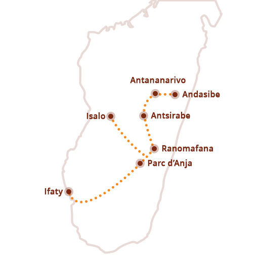 Je reis begint in hoofdstad Antananarivo, waarna je koers zet naar het weelderige regenwoud van Andasibe. Via de koloniale hooglanden rond Antsirabe trek je verder naar Ranomafana, beroemd om zijn tropisch regenwoud en unieke wildlife. Onderweg maak je kennis met de lokale cultuur in het community-reservaat van Anja. Vervolgens reis je zuidwaarts naar de indrukwekkende kloven en rotspartijen van Isalo National Park. Je sluit de reis ontspannen af aan de stranden van Ifaty, voor een duik in de zee of simpelweg een cocktail bij zonsondergang.