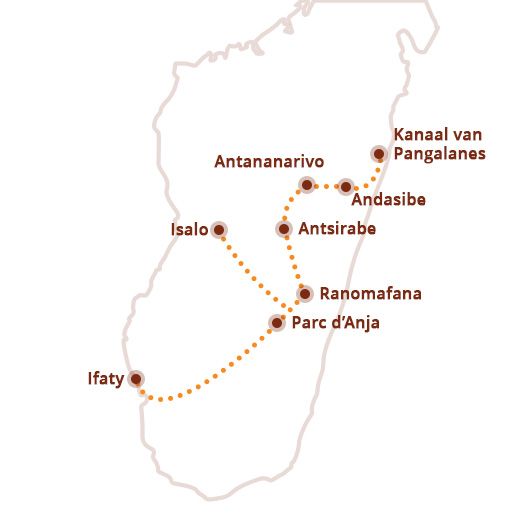 Je start in Antananarivo, waar koloniale charme en levendige markten je verwelkomen. Vervolgens reis je naar het regenwoud van Andasibe en maak je een bijzondere boottocht over het Kanaal van Pangalanes. Daarna volg je de hooglanden met hun vulkanische meren en ambachten richting Ranomafana. Via Parc d’Anja en de kloven van Isalo reis je verder naar de westkust voor strand en ontspanning in Ifaty. De reis eindigt in Antananarivo, waar je de laatste indrukken van dit bijzondere eiland opdoet.