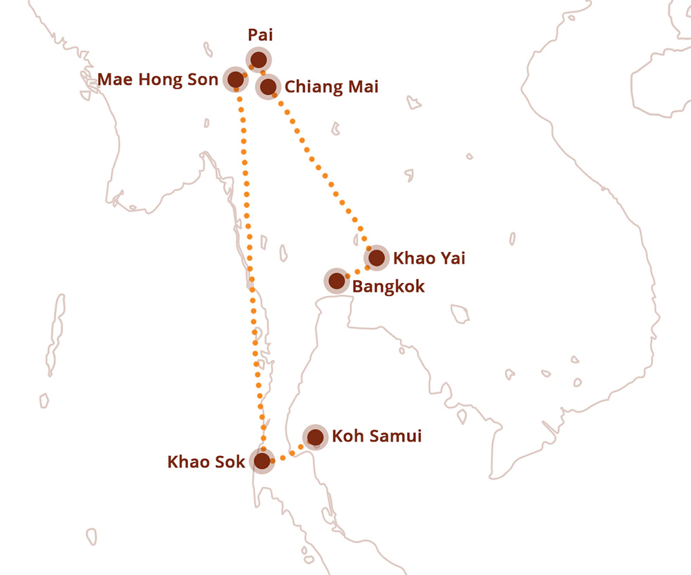 Deze reis biedt een unieke mix van avontuur, cultuur en ontspanning. Je verblijft in comfortabele 2-persoonskamers terwijl je Bangkok en zijn tempels ontdekt, gaat hiken in het indrukwekkende Khao Yai National Park, geniet van de natuur en cultuur in Chiang Mai, Pai en het historische Sukhothai. Een spectaculaire jungletour in Khao Sok National Park brengt je naar het serene Cheow Lan-meer. De reis sluit af met een heerlijke strandverlenging op Koh Samui, waar je kunt genieten van tropische stranden en het bruisende nachtleven. Een perfecte balans van actie en rust in één onvergetelijke reis!