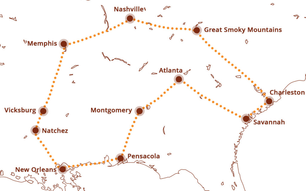 Begin in Atlanta, waar moderne wolkenkrabbers en zuidelijke charme elkaar ontmoeten. Ontdek de historische en sfeervolle straten van Savannah en Charleston en kijk je ogen uit naar de mysterieuze bergen van de Great Smoky Mountains. Beleef het muzikale hart van Amerika in Nashville en Memphis met livemuziek, bluesclubs en iconische muziekgeschiedenis. Ga verder naar de charmante steden Vicksburg en Natchez, verken het kleurrijke New Orleans en sluit je avontuur af met de luchtvaartgeschiedenis van Pensacola en de burgerrechtenverhalen van Montgomery.