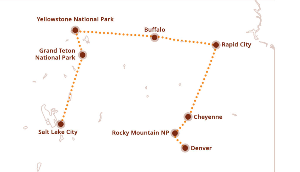 Ervaar een onvergetelijke reis door het hart van het westen van de Verenigde Staten, met hoogtepunten zoals de dynamische stad Denver, de natuurlijke wonderen van Rocky Mountain National Park en Yellowstone en de indrukwekkende bergen van Grand Teton. Van cowboycultuur in Cheyenne tot de levendige sfeer van Salt Lake City, deze route biedt een perfecte combinatie van avontuur, geschiedenis en schoonheid. Ga mee op ontdekkingstocht door deze adembenemende regio!