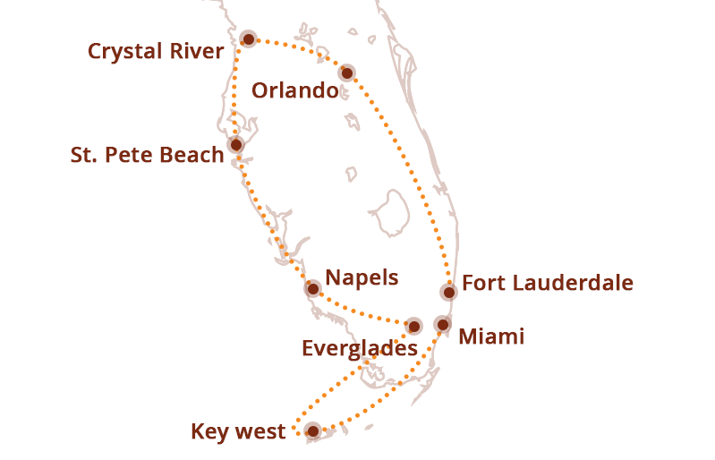 Maak kennis met Florida, beter bekend als “The Sunshine State,” waar zonovergoten dagen, levendige steden, ongerepte stranden en indrukwekkende natuur je opwachten. Deze 16-daagse rondreis voert je door het hart van een van Amerika’s meest geliefde staten. Dompel jezelf onder in de kleurrijke art-deco architectuur van Miami, snorkel tussen de prachtige koraalriffen van de Florida Keys, ervaar de unieke flora en fauna van de Everglades, en laat je verrassen door de magische wereld van Orlando’s wereldberoemde pretparken. Elke dag brengt nieuwe avonturen, vergezichten en ervaringen die deze reis tot een onvergetelijke belevenis maken. Van rustige, warme stranden tot bruisende steden en indrukwekkende natuurreservaten—Florida biedt eindeloze mogelijkheden voor iedere reiziger. Stap in en ontdek alles wat The Sunshine State te bieden heeft op de route door het zonnige hart van Amerika!