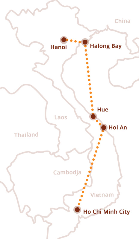 De reis begint in het levendige Hanoi, waar jullie kennismaken met de Vietnamese keuken en het bruisende straatleven. Daarna varen jullie door de magische Halong Bay, langs kalksteenrotsen en vissersdorpjes. In Hue duiken jullie in de keizerlijke geschiedenis en in Hoi An ontdekken jullie lokale ambachten en fietsen jullie door het platteland. Tot slot wacht het energieke Ho Chi Minh City en een bijzondere tocht door de Mekongdelta. Een veelzijdige reis vol cultuur, natuur en leuke ontmoetingen – samen genieten, ontdekken en beleven.